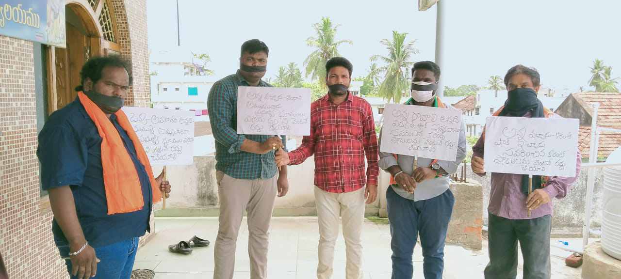 నర్సీపట్నం : బిజెపి రాష్ట్ర అధ్యక్షులు కన్నా లక్ష్మీనారాయణ పిలుపు మేరకు మంగళవారం రాష్ట్రవ్యాప్తంగా జరిగిన కార్యక్రమంలో భాగంగా కరెంటు ఛార్జీలు పెంపు మరియు ప్రభుత్వ భూముల విక్రయం జి.ఓ లను తక్షణం రద్దు చేయాలని నర్సీపట్నం పట్టణం బి.జే.పి అధ్యక్షులు యడ్ల గణేష్ ఆధ్వర్యంలో నోటికి నల్ల రిబ్బన్ ధరించి నిరసన కార్యక్రమం చేయడం జరిగినది.ఈ నిరసన కార్యక్రమంలో భాగంగా ఎడ్ల గణేష్ మాట్లాడుతూ పెంచిన కరెంటు చార్జీలను తక్షణం రద్దు చేయాలని డిమాండ్ చేశారు. నర్సీపట్నం అసెంబ్లీ కన్వీనర్ కాళ్ల సుబ్బారావు మాట్లాడుతూ వేలం ద్వారా ప్రభుత్వ భూములను చౌకగా తమ అనుచర వర్గాలకు దక్కేలా ఏర్పాటుచేసిన ఈఅమ్మకాల ప్రక్రియపై ఇచ్చిన జీవోను రద్దు చేసి ప్రజల ఆస్తులను కాపాడాలని లేనిపక్షంలో బిజెపి ఆధ్వర్యంలో రాష్ట్ర వ్యాప్తంగా తీవ్ర ఆందోళన తప్పదని హెచ్చరించారు. రాష్ట్ర ప్రభుత్వం కరోనా సహాయం ఒక చేత్తో వెయ్యి రూపాయలు ఇచ్చినట్లు ఇచ్చి మద్యం అమ్మకాలు పేరుతో మరో చేత్తో లాక్కుంటుందని ఇదెక్కడి ప్రభుత్వ విధానం అని ప్రశ్నించారు.ఓబీసీ మోర్చా నాయకులు వెంకటేశ్వరరావు యాదవ్( బాబా) మాట్లాడుతూ గతంలో వచ్చిన కరెంటు బిల్లులు ఈ నెలలో వచ్చిన కరెంటు బిల్లులకు పొంతన లేకుండా పోయిందని,గత మార్చి నెలలో బిల్లు 400 వచ్చింది మరి ఏప్రిల్ నాటికి అదే బిల్లు 3500 రూ..లుకు ఎలా వెళ్ళిందని ప్రశ్నించారు. గొలుగొండ మండల నాయకులు పల్లా రమణ యాదవ్ మాట్లాడుతూ రాష్ట్ర ప్రభుత్వ విధానాలు అస్తవ్యస్తంగా ఉన్నాయని కరోనా వలన గ్రామీణవ్యవస్థ అభివృద్ధికి ప్రణాళిక లేకపోవడమే ఉదాహరణన్నారు. ఈ కార్యక్రమంలో పట్టణ ప్రధాన కార్యదర్శి ఐ.సంతోష్, పట్టణ ఎస్సీ మోర్చా అధ్యక్షులు నేతల బుచ్చిరాజు, చిన్నికృష్ణ,పృద్వి పండు తదితరులు పాల్గొన్నారు…